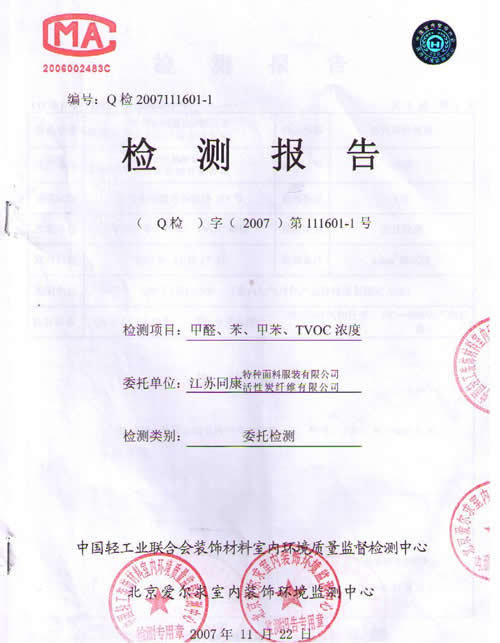 活性炭纖維織物窗簾檢測報告